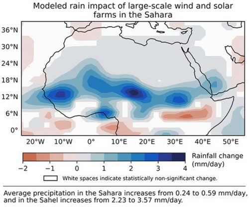 伊利諾伊大學(xué)和馬里蘭大學(xué)的研討人員在本周的科學(xué)雜志上宣布了一篇新文章,經(jīng)過“氣候模型”顯現(xiàn)撒哈拉沙漠中的大型風(fēng)能和太陽能發(fā)電廠添加了雨水和植被,提醒了氣候模仿研討的效果。