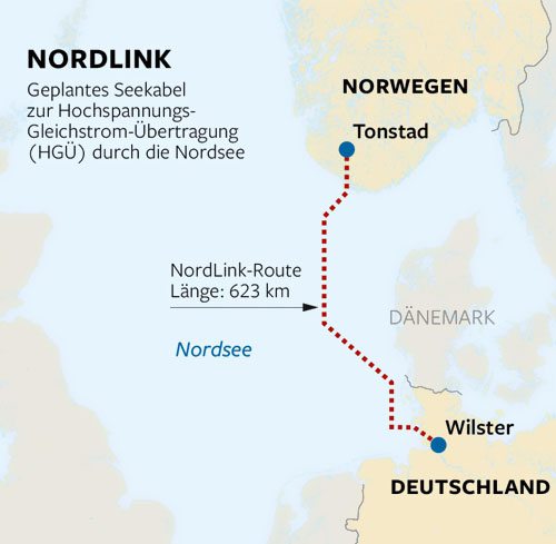 NordLink是首個(gè)銜接德國(guó)和挪威電網(wǎng)的互聯(lián)體系,被視為可再生動(dòng)力交流的高度互補(bǔ),由于德國(guó)的風(fēng)能和太陽(yáng)能發(fā)電場(chǎng)以及挪威的水力發(fā)電廠(chǎng)能夠作為德國(guó)進(jìn)口動(dòng)力的“動(dòng)力庫(kù)”。 滕特將在接下來(lái)的幾周內(nèi)將99公里(62英里)的海底電纜埋入海床。下一年,它將在德國(guó)近海區(qū)域再鋪設(shè)55公里的海底電纜,直至丹麥領(lǐng)海。2018年和2019年將在丹麥北海鋪設(shè)228公里的海底電纜段,而挪威領(lǐng)海的134公里海底電纜段將準(zhǔn)備就緒。 NordLink海底電纜的整個(gè)長(zhǎng)度為623 km,包含陸地電纜部分。該項(xiàng)目由挪威國(guó)家電網(wǎng)Statnett和DC Nordseekabel GmbH&Co KG一起開(kāi)發(fā)施行。后者是由滕特和德國(guó)開(kāi)發(fā)銀行KfW一起具有的合資企業(yè)。 依據(jù)方案,NordLink將于2020年建成投產(chǎn),總?cè)萘康竭_(dá)1.4吉瓦。